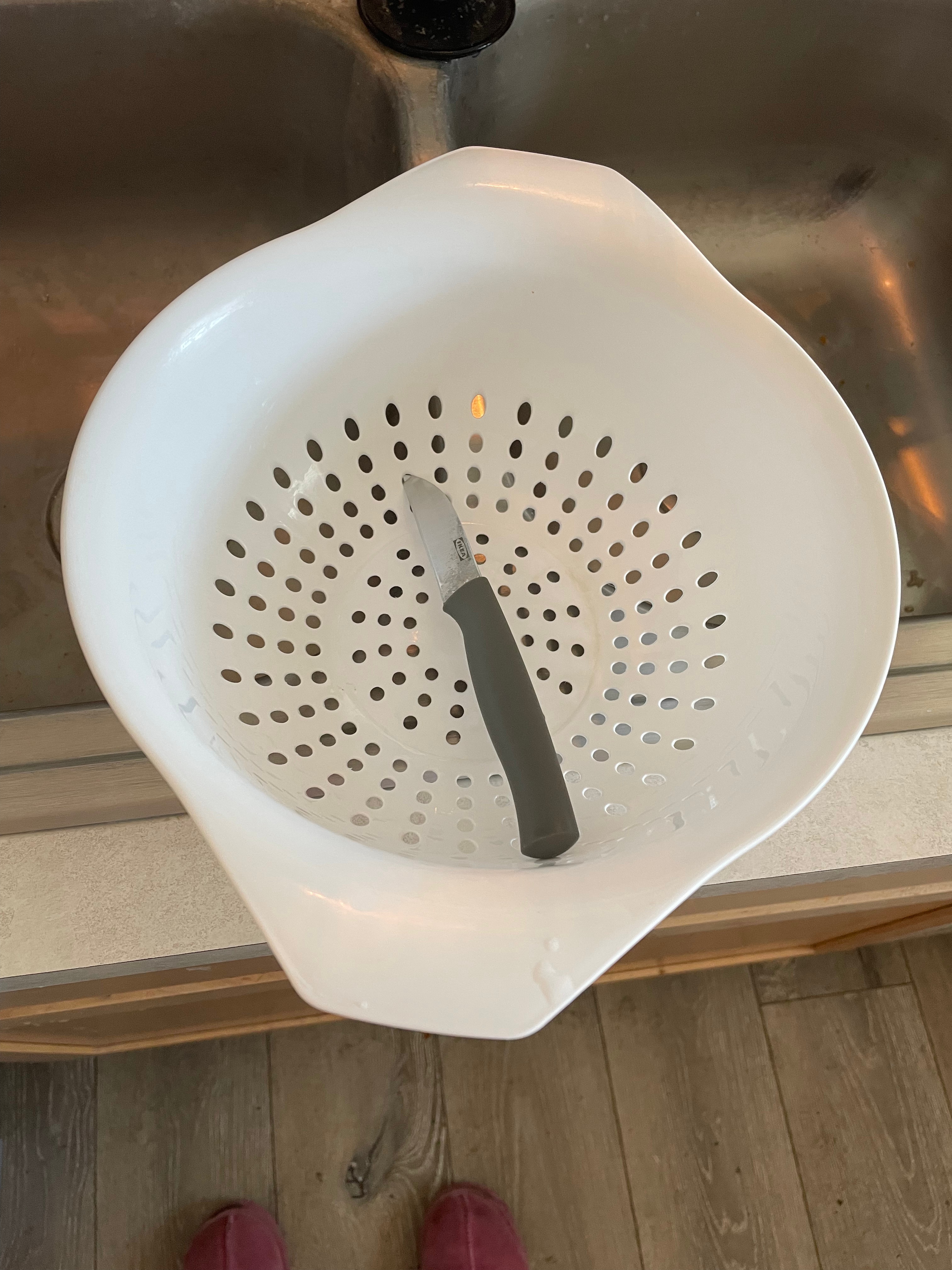 Then, I take a paring knife, colander, apricots, and the garbage can to the sink. I take each apricot, rinse it thoroughly to get off any bird droppings, check for (and remove) external blemishes, then split the apricots in half, removing the pits, and place the apricot into the colander.
