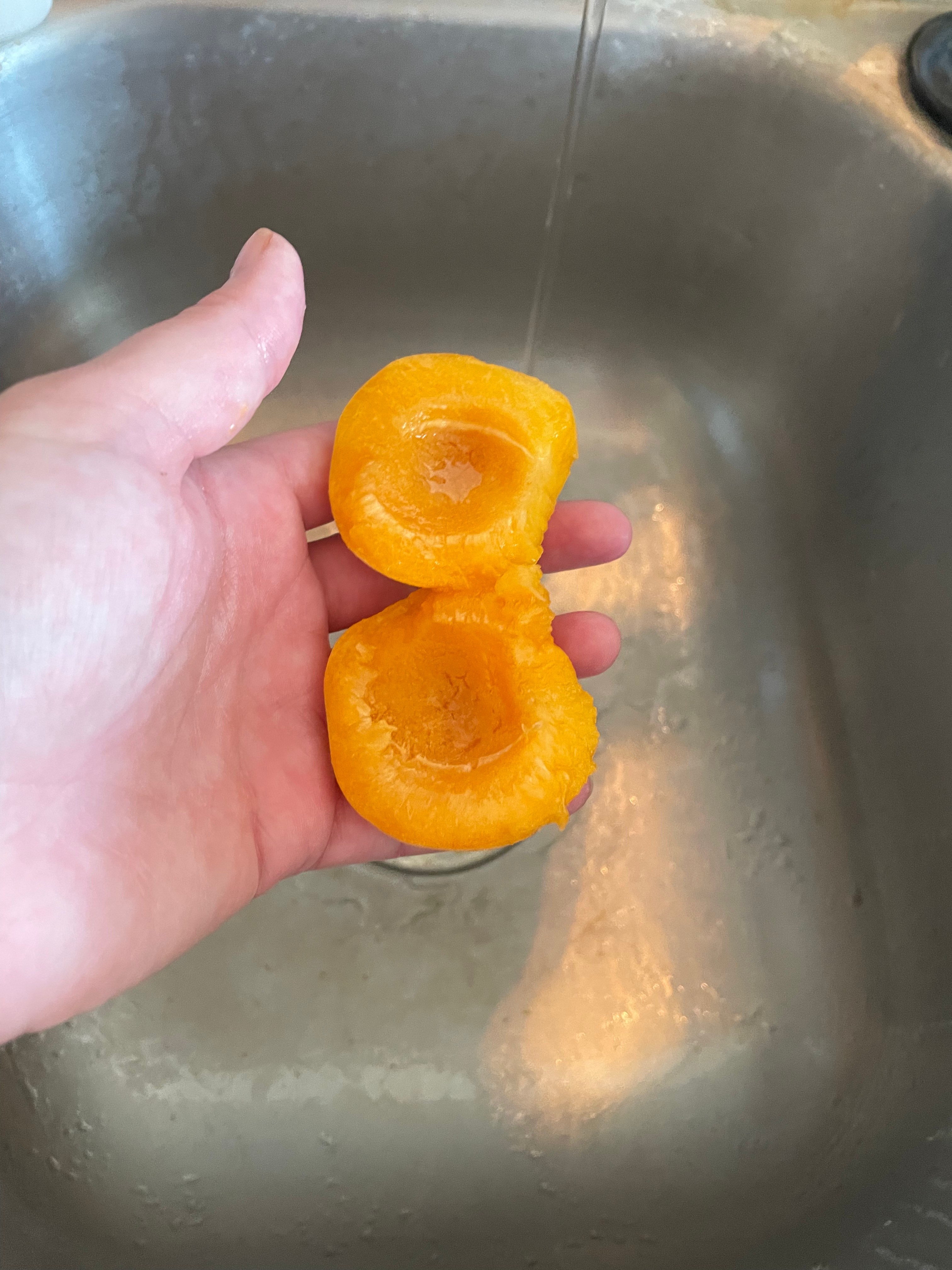 Preparing apricots for canning can be quite the process, and individuals definitely have preferences. I prefer to rinse and pit the apricots before removing the skins, but it isn’t strictly necessary. I just don’t want to go to the trouble of skinning apricots that I won’t be able to use, and opening and pitting them allows me to make sure they don’t have mold, bugs, or eggs inside before going further with them.