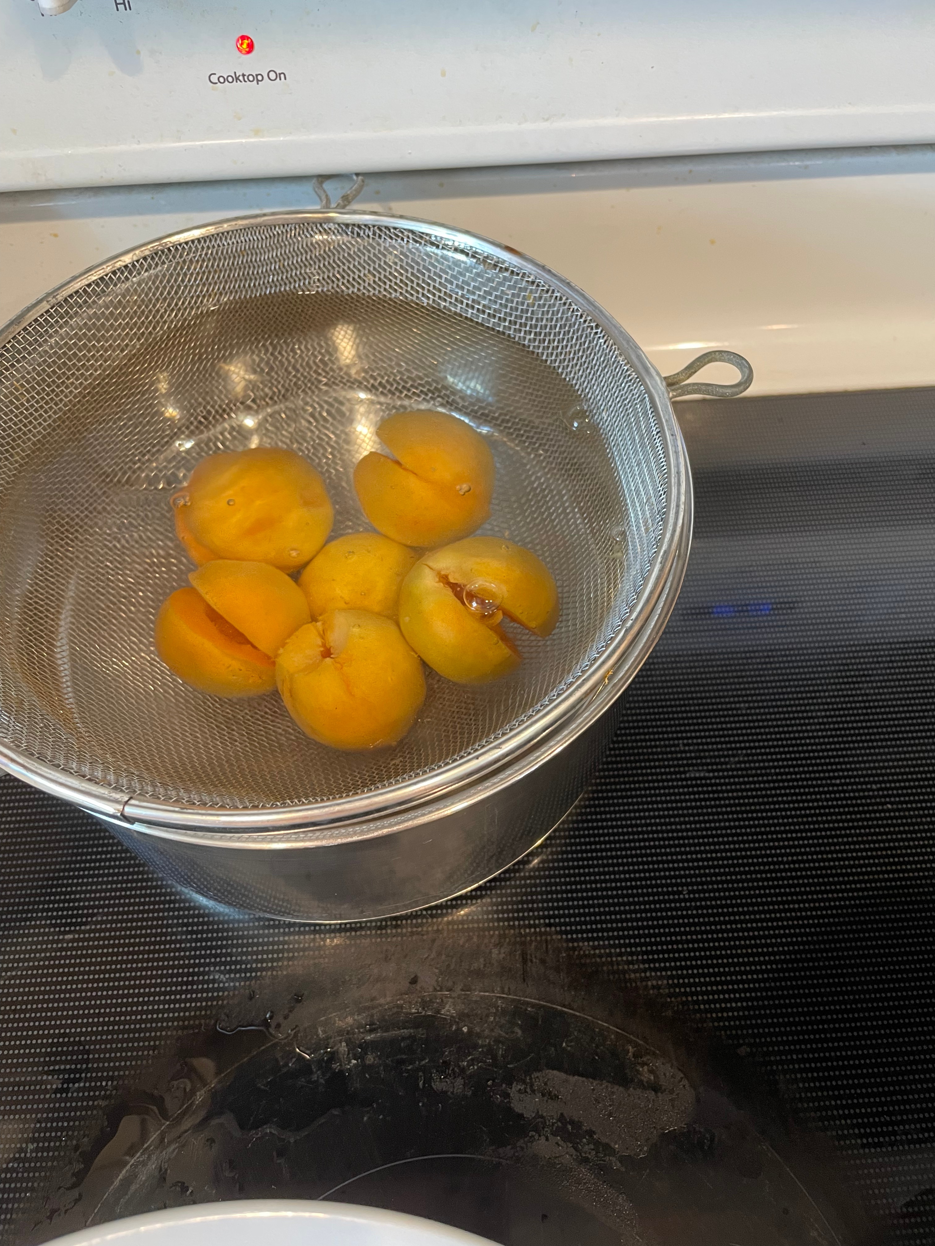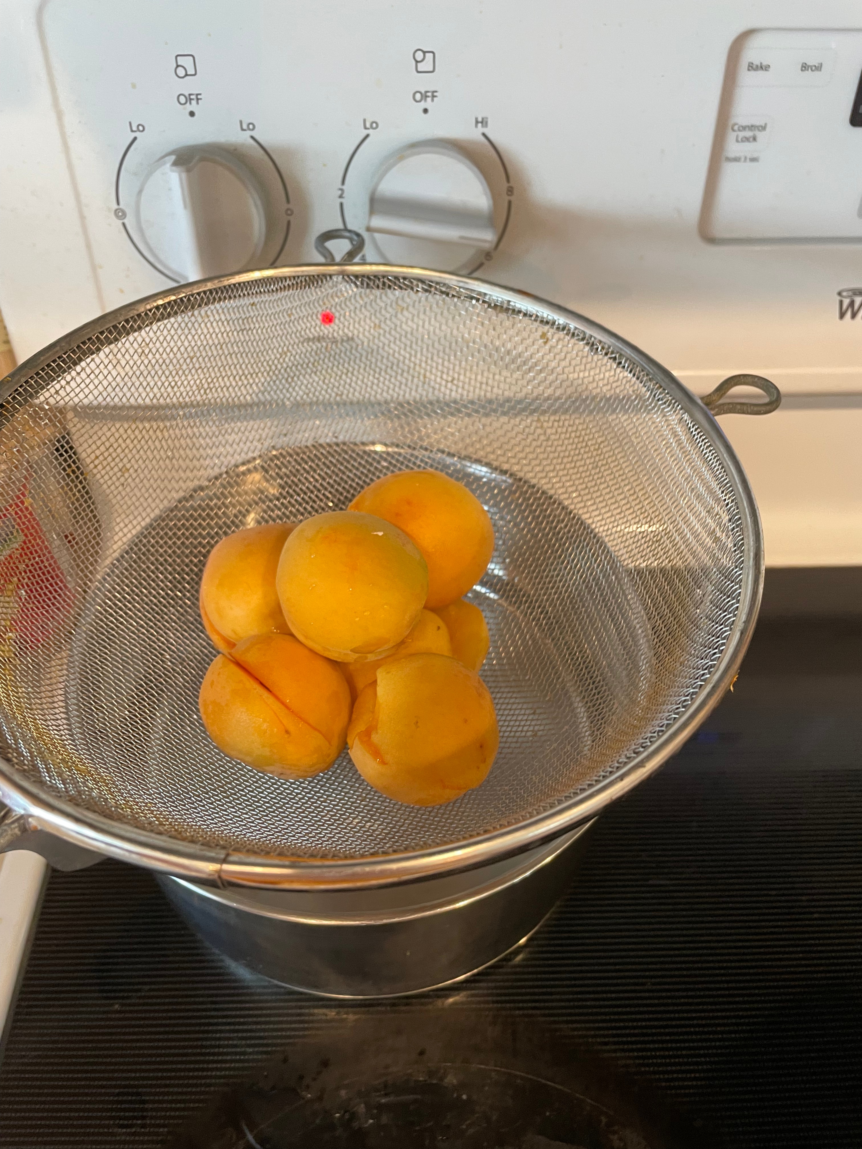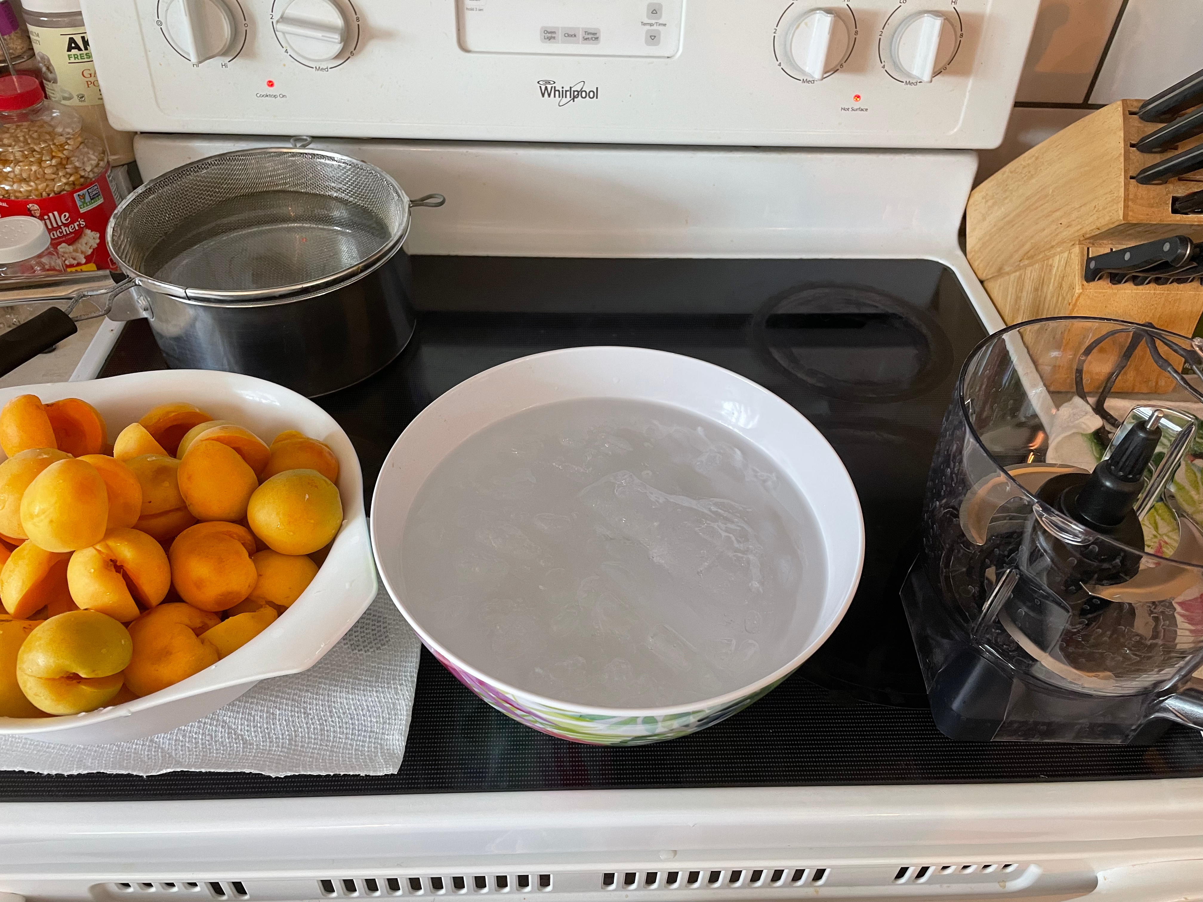 As soon as the water on the stove boils, I add a few apricots to the metal strainer, dip the strainer and apricots into the boiling water for 30-45 seconds, lift it out and place it into the ice water. The skins should just slide off, and as they do, I add them to the food processer. One full colander fills the food processer to the 64 oz mark.