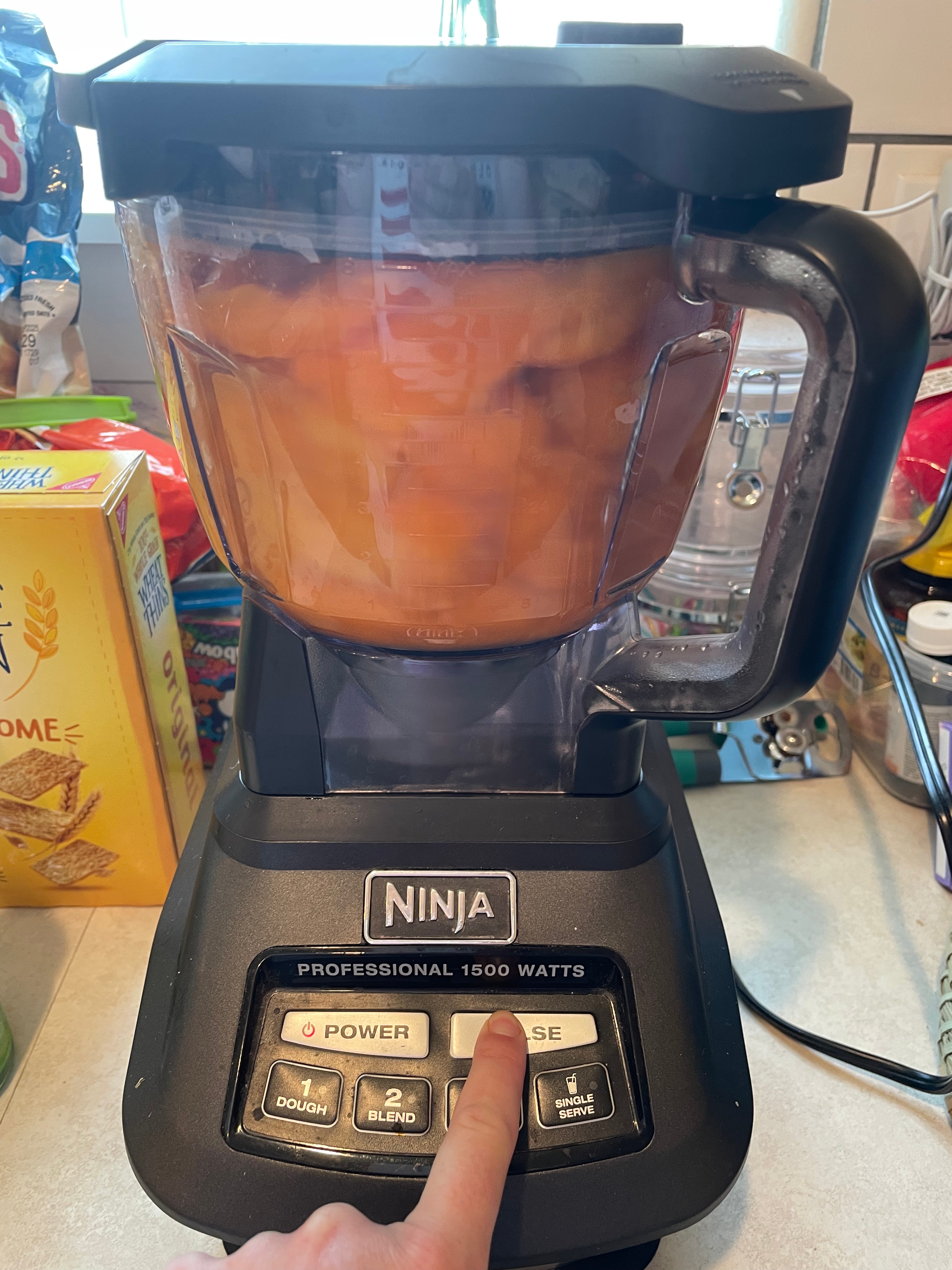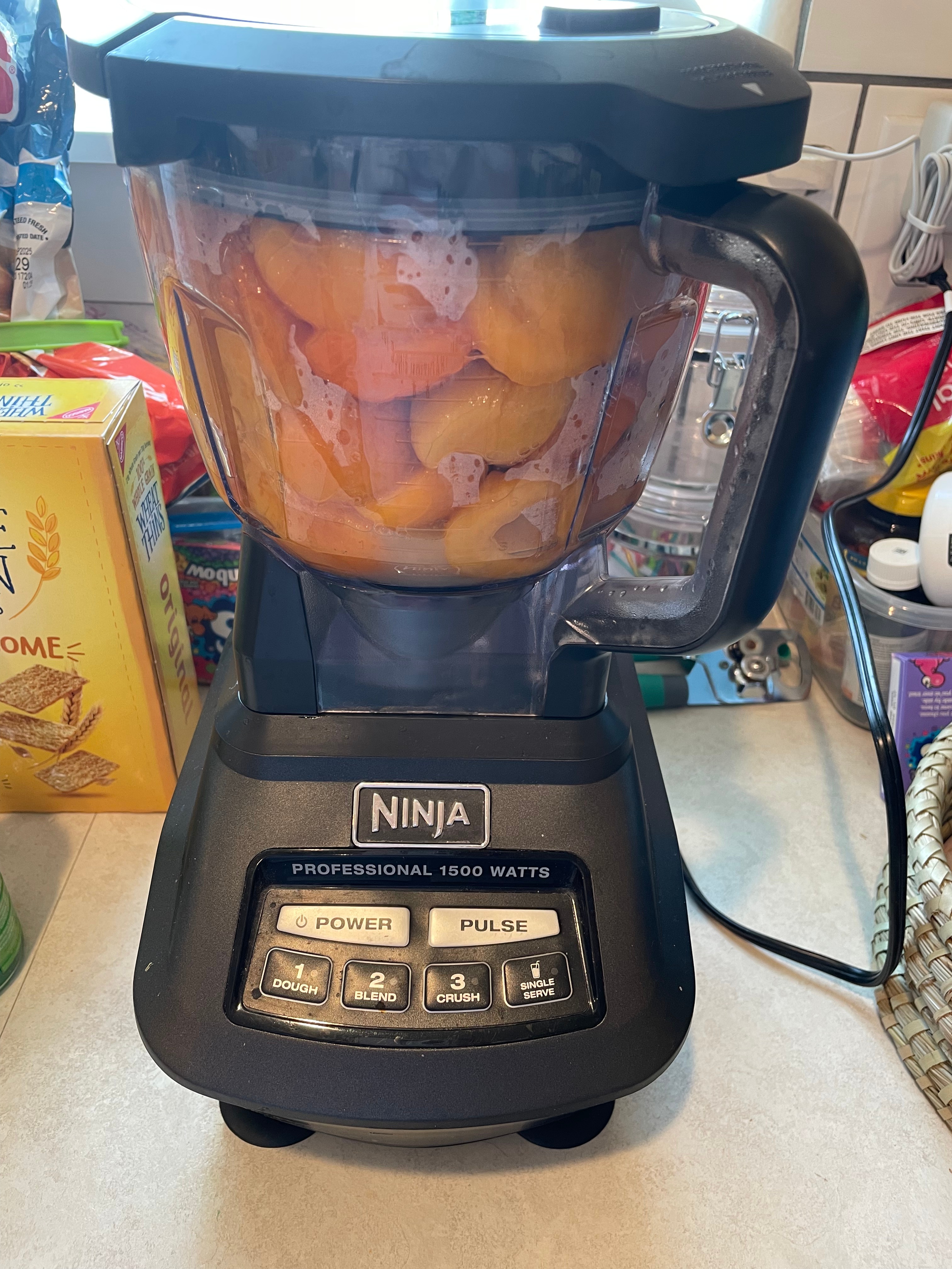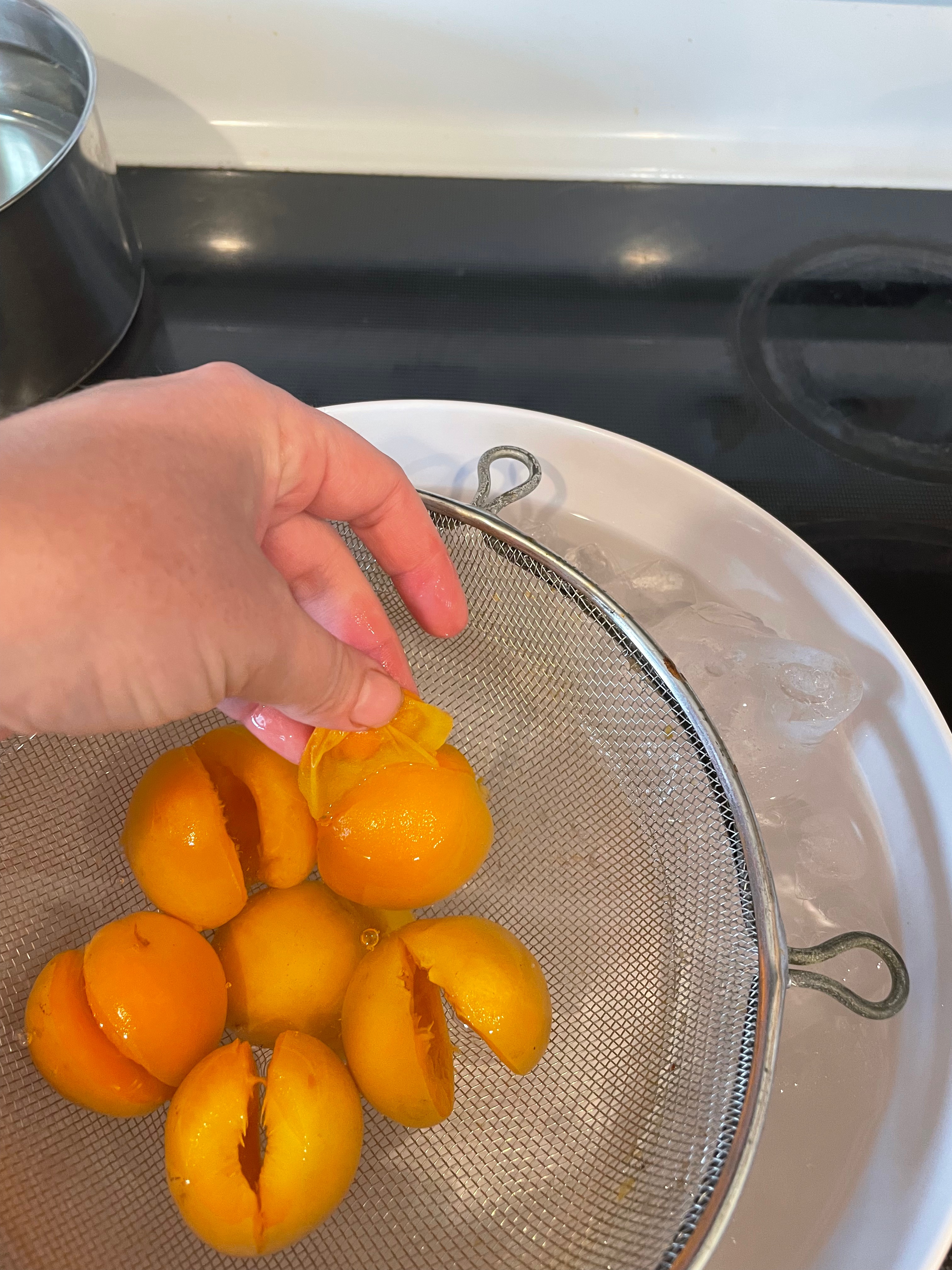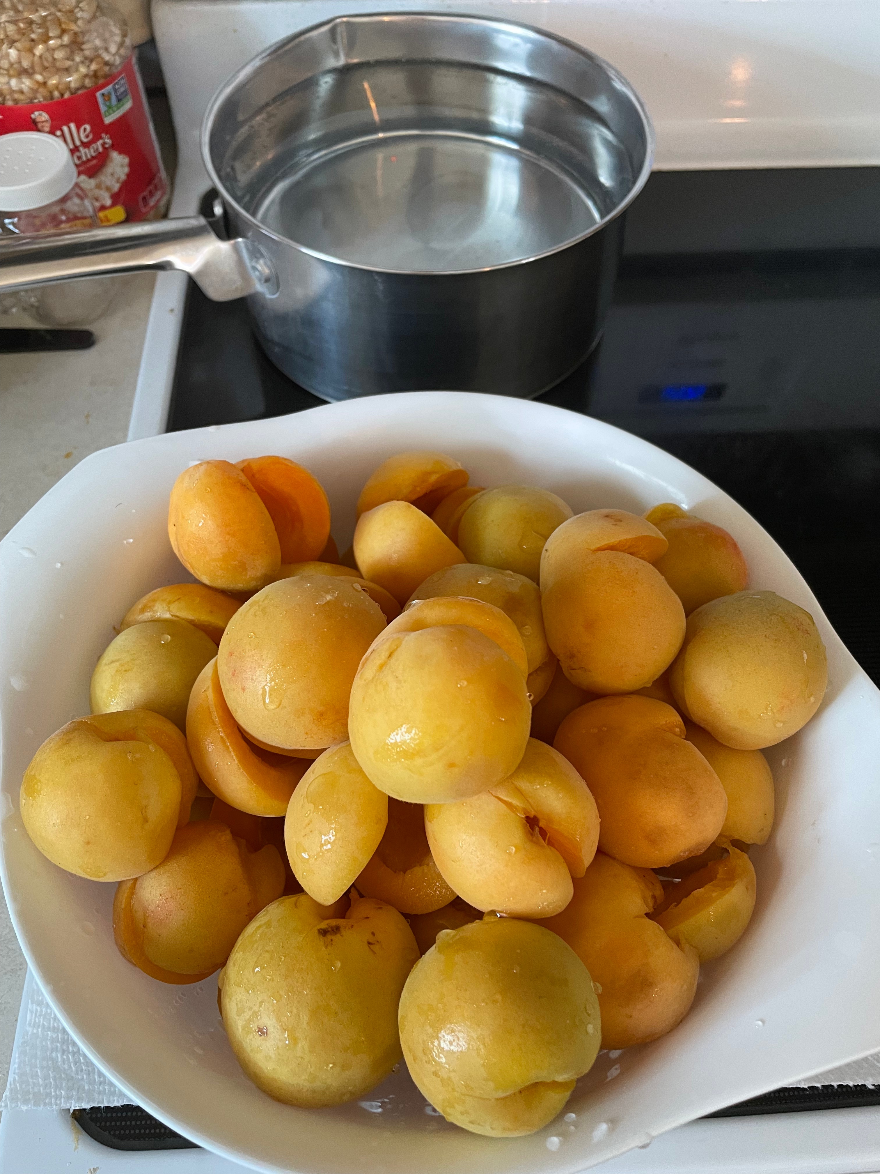 As soon as the water on the stove boils, I add a few apricots to the metal strainer, dip the strainer and apricots into the boiling water for 30-45 seconds, lift it out and place it into the ice water. The skins should just slide off, and as they do, I add them to the food processer. One full colander fills the food processer to the 64 oz mark.