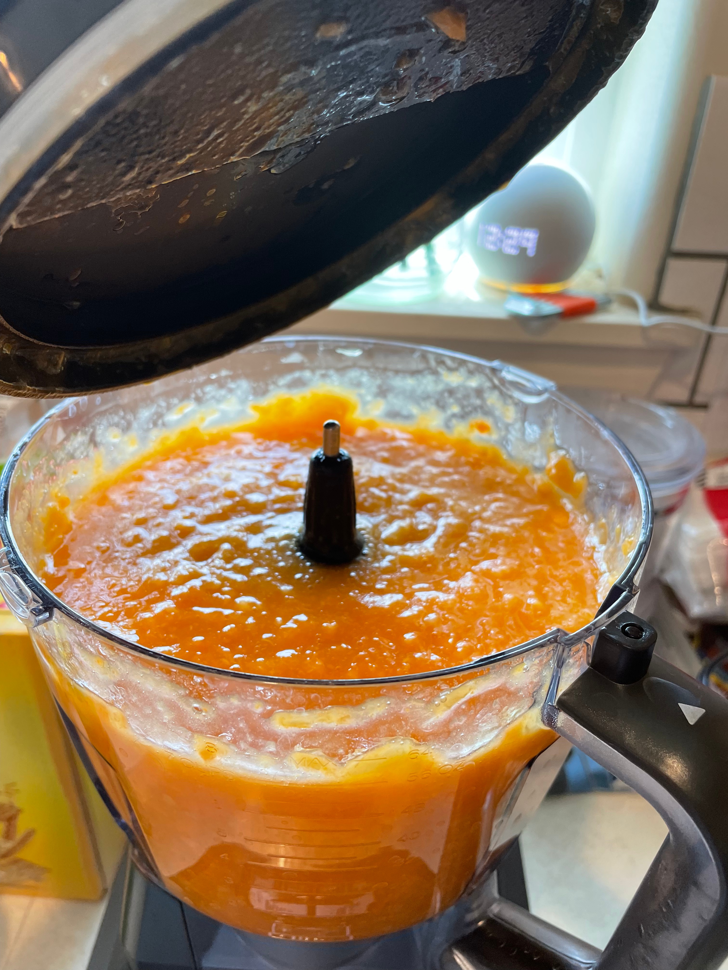 I then run the food processer, add the recommended amount of lemon juice (1tbsp/4c. apricot puree for jam without pectin), blitz it once more to spread the lemon juice through, move the puree to a container and refrigerate the puree until I have finished pitting and peeling all of the apricots for the day.