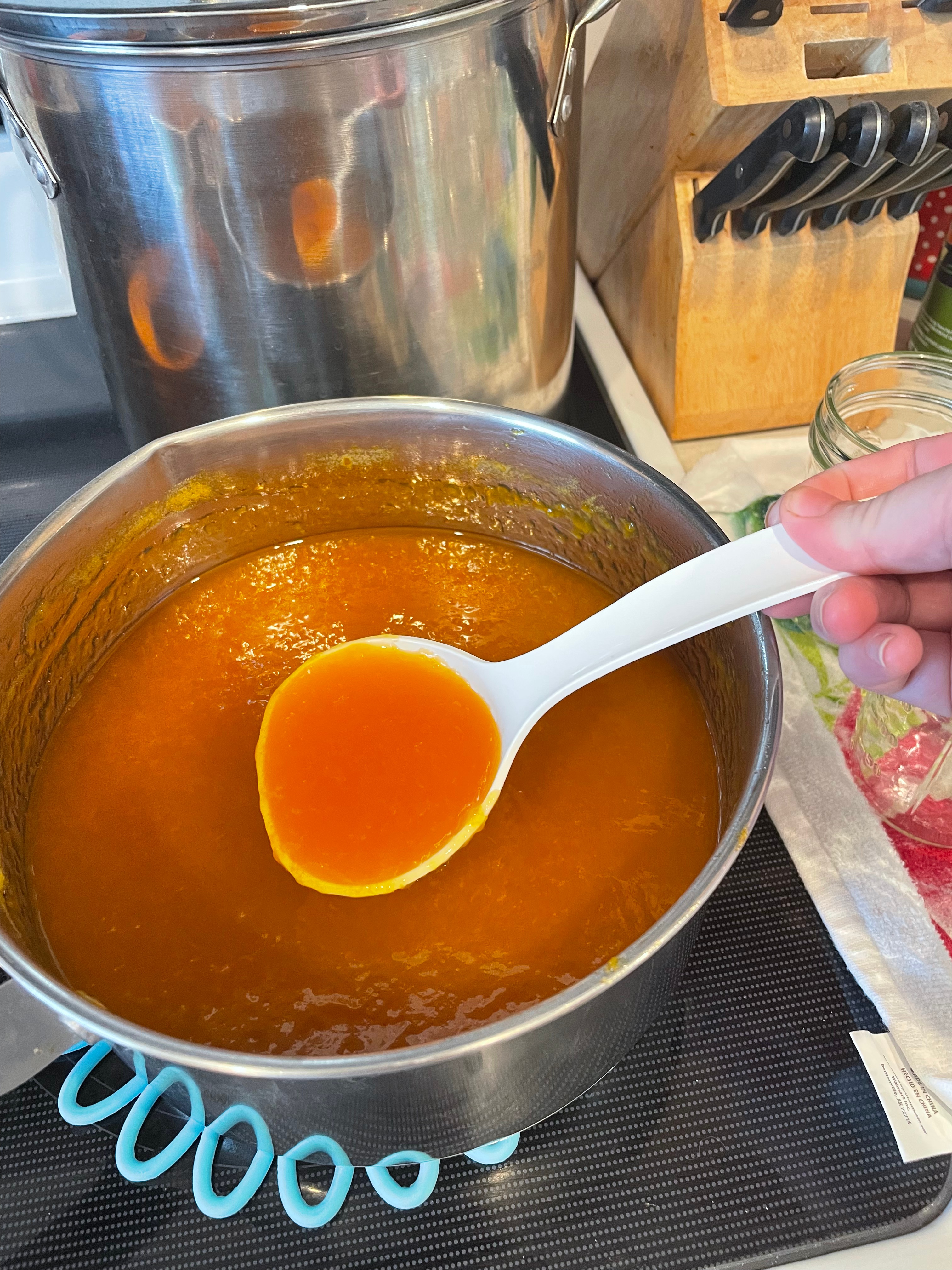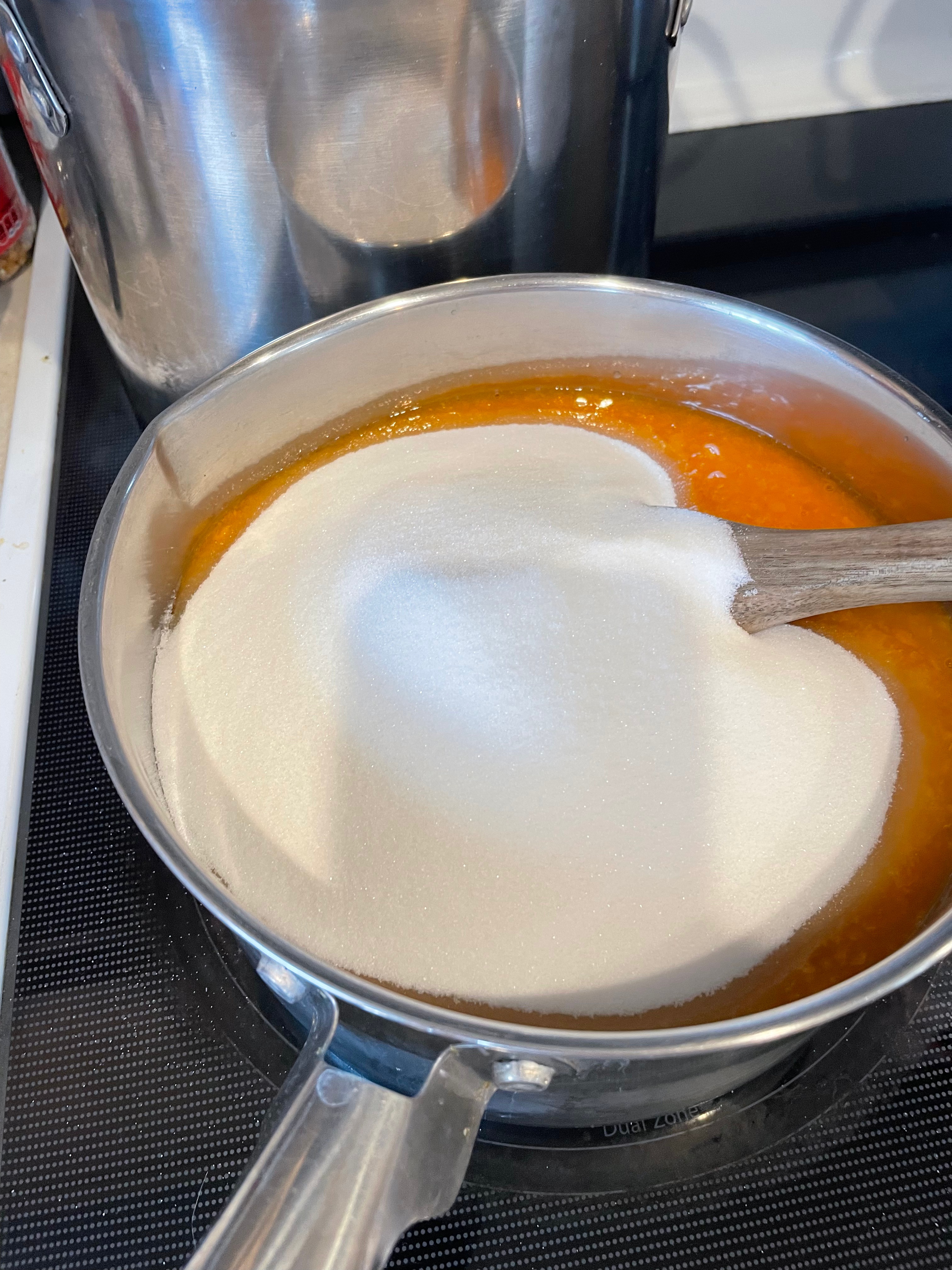 Taking your prepared apricots measure out 6 cups of puree, place it into a pan, and add 3 cups of granulated sugar. Stir it together, bring it to a boil, and let it boil while stirring until it starts to hold its shape. I found this takes about an hour after the boiling starts, and since nearly constant stirring is required to prevent scorching, I recommend using the bathroom and getting a glass of water (and maybe a chair) before beginning.
