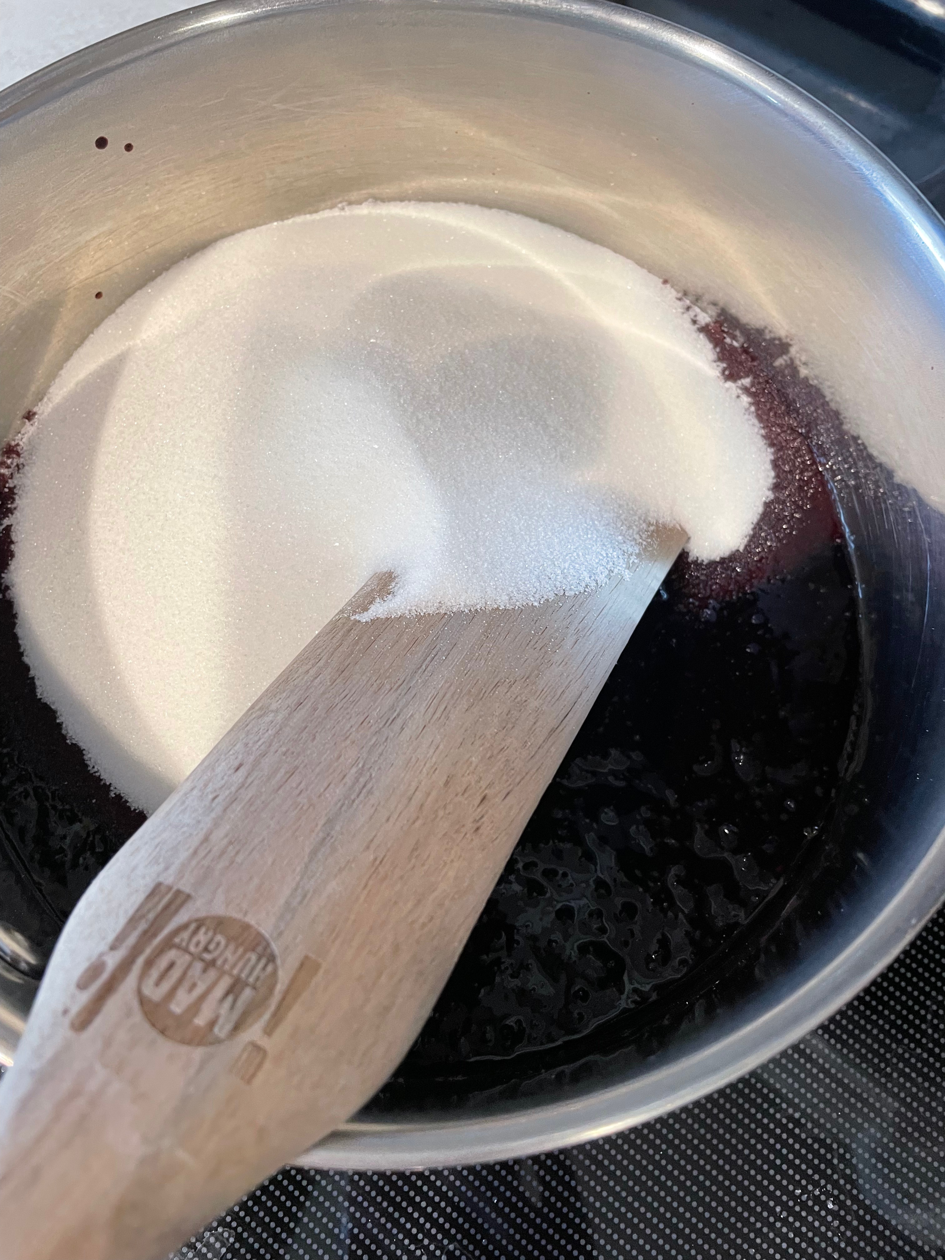 I began by rinsing the blackberries and putting them through the food processor using the plastic paddles, like I did for the raspberries. Then, as recommended in the USDA canning guide, I added the blackberries to my pan, and added an equal amount of sugar. For this batch, I had 2.5 cups of blackberries and the same amount of sugar.