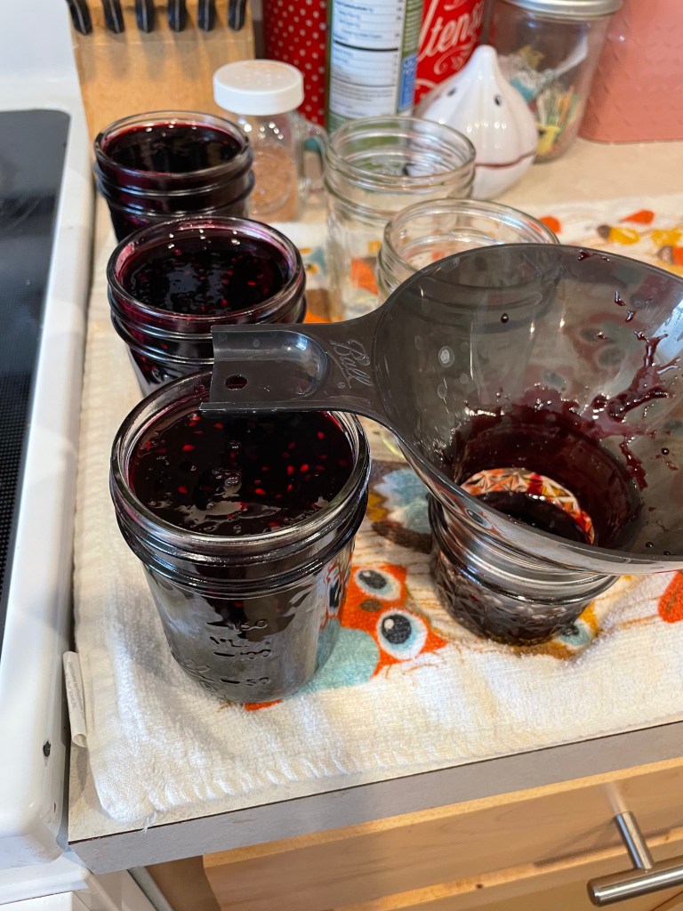I brought the blackberries and sugar to a full rolling boil while continuing to stir. 10 minutes at a rolling boil still held for getting the mixture to reach the jelling consistency I wanted. Then, I ladled the mixture into my jars, centered the lids, and finger-tightened the rings.