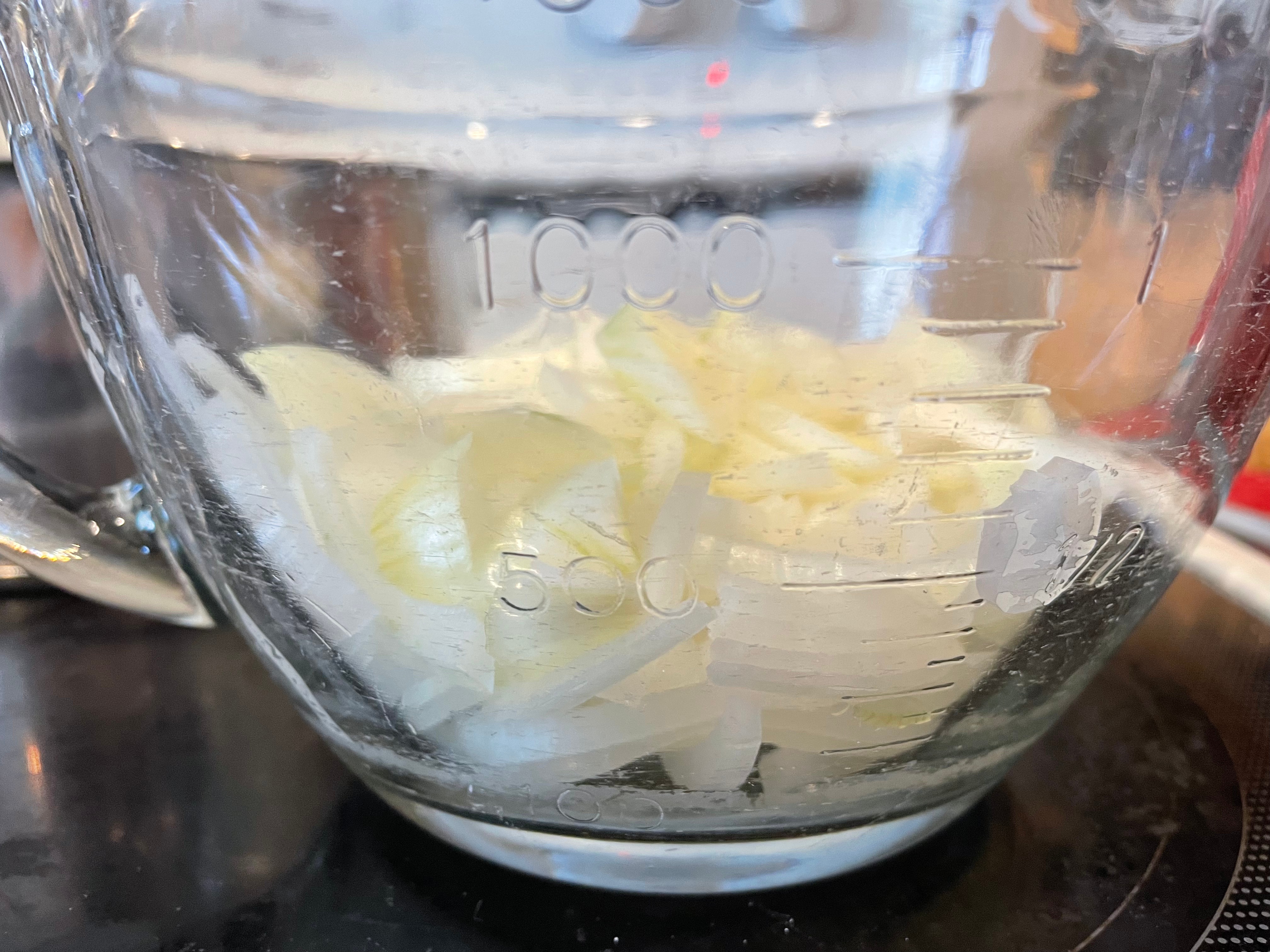 I cubed the butter and dropped it into my pan, then sliced the onion as thin as I could, quartered the slices, and added them to the pan as well. I measured my milk and pork stock into a bowl together to make them easier to add. I put the pan with butter and onions onto the stove and began heating it over medium heat.