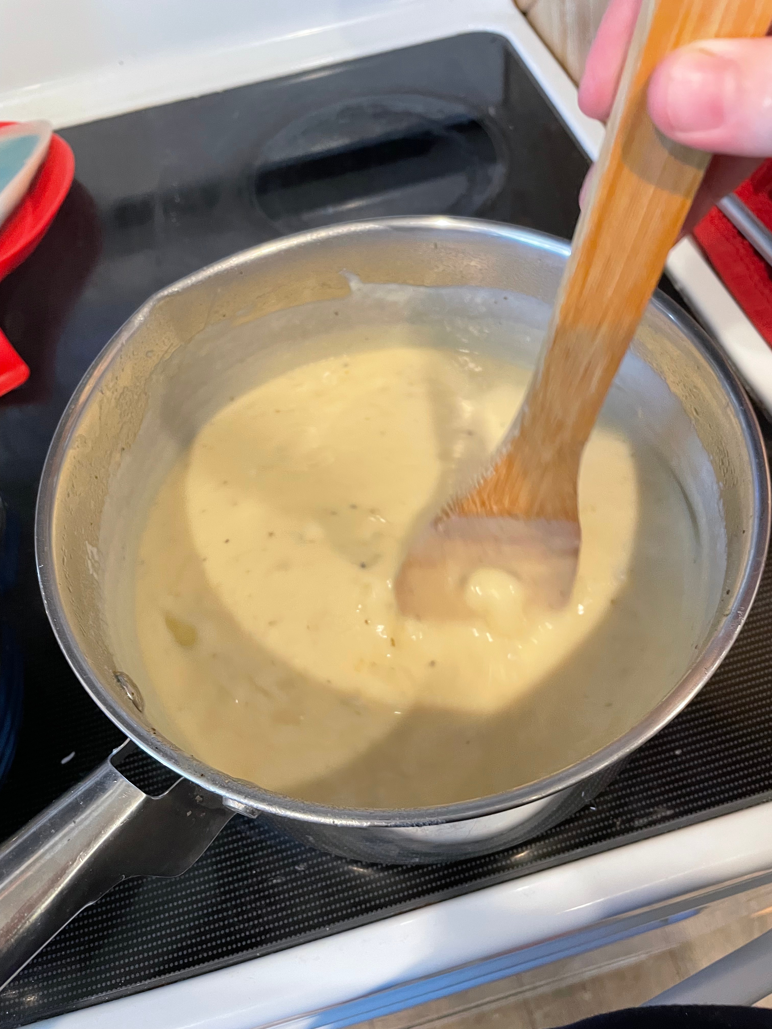 Once the butter melted, I continued to cook and stir the onions and butter for about 5 minutes until the onions were tender. I then added the roasted garlic and herb seasoning and flour, mixing well. Next, I added the stock and milk mixture, continuing to stir it constantly. This was about the time I realized I wouldn’t be able to grate the cheese for myself, so I asked my son to help. I did taste test the soup as I went, and added ground black pepper, salt, garlic powder and onion powder in addition to the roasted garlic and herb seasoning I had used initially. Thirty minutes or so later, the soup had started to boil. I stirred and cooked it for 1 minute as directed, then reduced the heat and added the cheese.